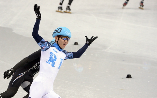 | ▲ 러시아 쇼트트랙 대표 안현수(러시아명 빅토르 안)가 21일 오후(현지시각) 러시아 소치 해안클러스터 아이스버그 스케이팅 팰리스에서 열린 남자 쇼트트랙 5000m 계주에서 금메달을 차지하고 환호하고 있다./뉴시스 | ||
