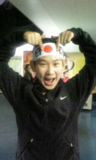 사진 속 데니스 텐은 머리에 일장기를 머리에 두르고 일장기를 가리키며 환하게 웃고 있는 모습이다.