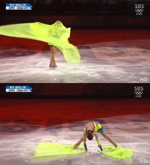 올림픽 피겨 금메달리스트 다운 면모는 찾아볼 수 없었다. 커다란 깃발을 주체하지 못해 스케이트로 밟고 버둥거리는가 하면 점프도 밋밋했다.