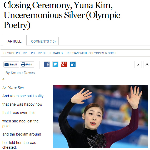 24일(한국시간) 새벽 월스트리트저널은 소치 동계올림픽 폐막식에 맞춰 온라인판에 김연아에게 바치는 헌정시를 게재했다.