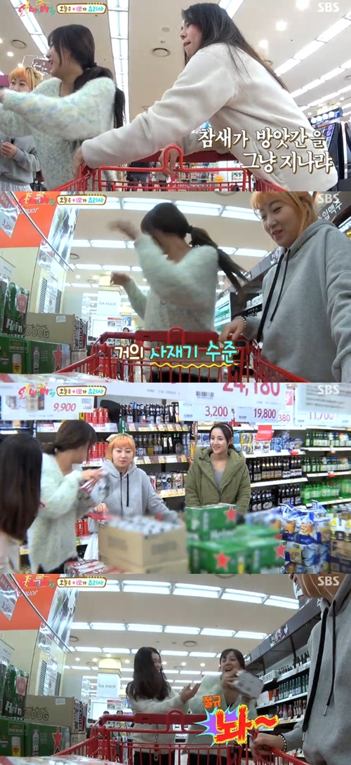 하지만 마트를 찾은 고은아의 눈에 먼저 들어온 것은 주류코너였다. 고은아는 사재기를 방불케 할 정도로 다량의 맥주를 쇼핑카트에 넣었고, 이를 말리는 언니들을 뿌리치는 모습까지 보여 웃음을 자아냈다.