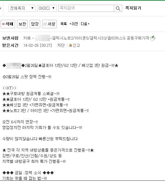 유명 커뮤니티 게시판에는 “2월26일 스팟 정책”이라며 “KT 번호이동 아이폰5S 3만원, 갤럭시S4 12만원, 77 부유 가유 유유”라며 단체 쪽지가 돌았다.