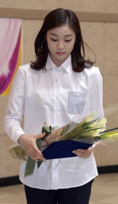 이날 김연아는 화이트 셔츠에 블랙 팬츠로 단정한 패션으로 자리에 등장했다. 또 어깨까지 닿는 머리 끝에 C컬로 발랄한 느낌을 연출해 눈길을 끌었다.