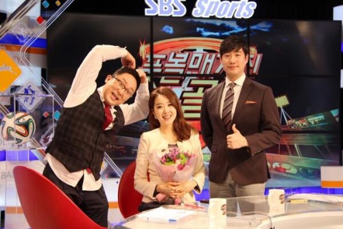 공개된 사진 속에서 김민지를 중심으로 배성재, 장지현 해설위원이 카메라 앞에 섰다. 배성재는 엄지 손가락을 치켜세웠고, 장지현 해설위원은 머리 위로 하트를 그리며 김민지 퇴사의 아쉬움을 달랬다.