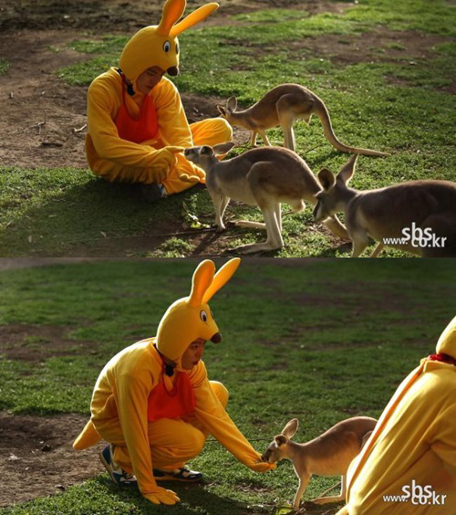 SBS '일요일이 좋다-러닝맨' 측은 7일 김우빈이 캥거루 복장을 하고 아기 캥거루에게 먹이를 주는 모습의 사진을 공개했다.