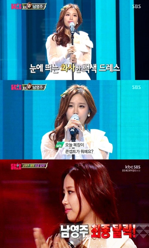 이날 'K팝스타3'에서 남영주는 심사위원 박진영의 노래 '너의 뒤에서'를 선곡했다. 노래를 부르기 전 무대에 등장한 남영주를 본 심사위원들은 하얀 드레스를 입고 나타난 남영주의 비주얼을 칭찬했다.