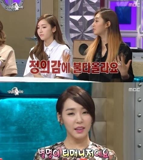 이날 방송에서 유리는 “일이 생기면 누군가가 얘기하기 전에 티파니가 이미 얘기하고 있다”며 “티파니는 팀에 대해 얘기할 때 정의감에 불타오른다. 그래서 별명이 ‘티매니저’”라고 말했다.