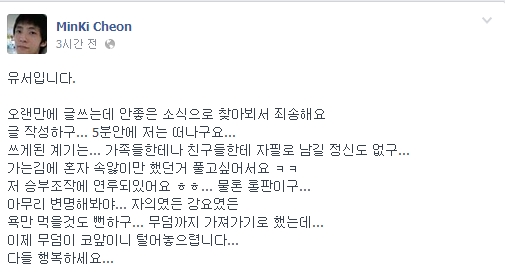 13일 오전 천민기는 자신의 페이스북에 “유서입니다. 오랜만에 글쓰는데 안좋은 소식으로 찾아봬서 죄송해요”라면서 “글 작성하고 5분 안에 저는 떠나고요. 쓰게 된 계기는 가족들한테나 친구들한테 자필로 남길 정신도 없고 가는 김에 혼자 속 앓이만 했던 거 풀고 싶어서요”라고 전했다.