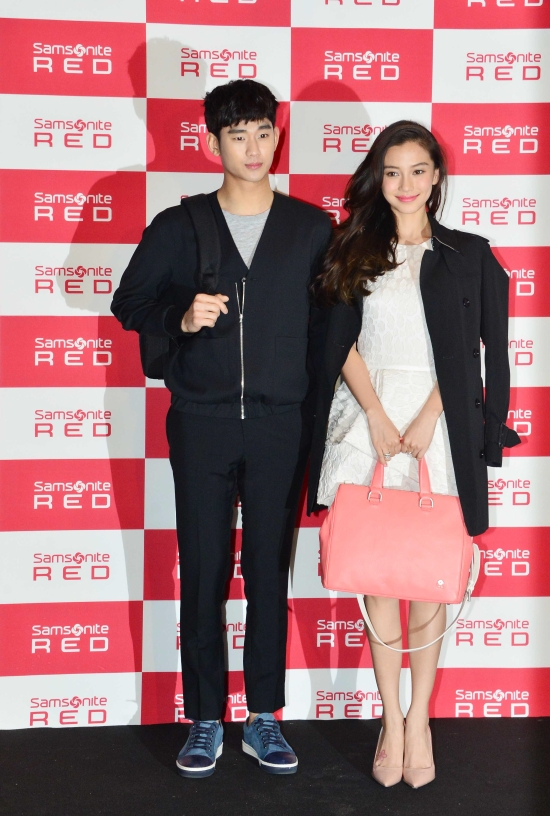 | ▲ 배우 김수현과 중국 배우 안젤라베이비가 13일 오후 서울 강남구 논현동 플래툰 쿤스트할레에서 열린 '쌤소나이트 레드 2014 S/S Be my red 패션쇼' 포토세션에서 포즈를 취하고 있다./뉴시스 | ||