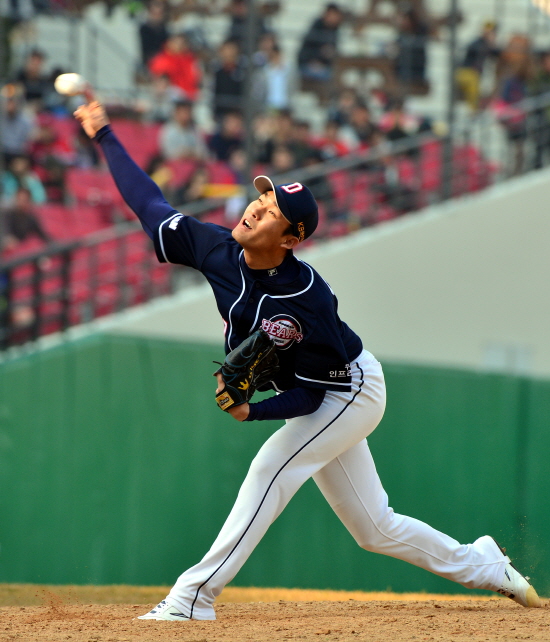 | ▲ 16일 오후 광주 북구 임동 광주·기아챔피언스필드에서 KIA 타이거즈 대 두산 베어스의 2014프로야구 시범경기가 펼쳐지고 있다. 두산 바뀐 투수 홍상삼이 역투하고 있다./뉴시스 | ||