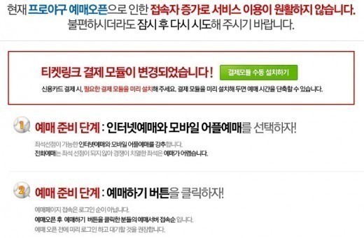 그러나 티켓링크 사이트가 ‘2014 한국 야쿠르트 세븐 프로야구’ 정규리그 티켓 예매 서비스로 폭주하면서 접속이 원활하지 못하다.