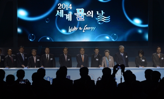 | ▲ 정홍원(오른쪽 여섯번째) 국무총리가 21일 오후 경기 고양 일산 킨텍스에서 열린 2014 세계 물의 날 기념행사에서 '물과 에너지' 퍼포먼스를 하고 있다./뉴시스 | ||