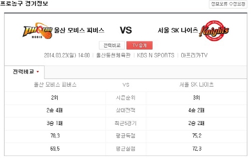 울산 모비스 피버스와 서울 SK 나이츠는 23일 울산동천체육관에서 2013~2014 KB국민카드 프로농구 4강 플레이오프 1차전을 갖는다.