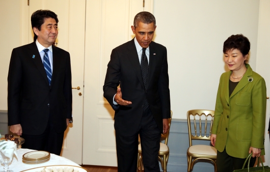 | ▲ 박근혜 대통령과 버락 오바마 미국 대통령, 아베 신조 일본 총리가 25일 오후(현지시간) 네덜란드 헤이그 미국 대사관저에서 한·미·일 정상회담을 하기 전 환담을 나누고 있다. /뉴시스 | ||
