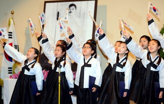 | ▲ 26일 오전 서울 중구 남대문로 안중근의사 기념관에서 열린 '안중근 의사 순국 104주기 추모식'에서 역사음악어린이 합창단이 태극기를 흔들며 '안중근 노래'를 부르고 있다./뉴시스 | ||