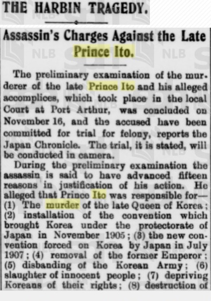 스트레이츠 타임스는 “최근 사망한 이토 백작의 저격자에 대해 11월 16일 예비심문을 한 결과 중죄를 범한 것으로 결론내리고 비공개 재판에 회부키로 했다”고 전했다. 10월 26일 이토 사살후 3주 만의 일이었다.