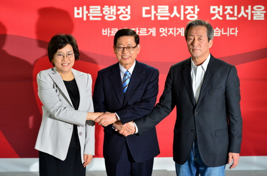 | ▲ 24일 오전 서울 여의도 김황식 전 국무총리 선거사무소에서 열린 개소식에서 새누리당 서울시장 경선 후보인 정몽준(오른쪽부터) 의원, 김황식 전 총리, 이혜훈 최고위원이 손을 맞잡고 있다./뉴시스 | ||