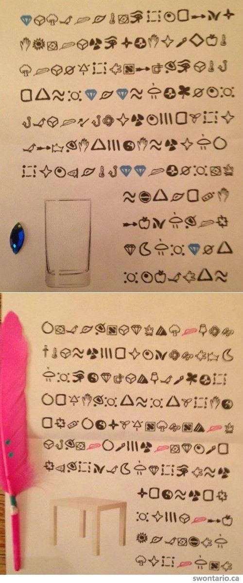 암호문을 보면 뜻을 알 수 없는 그림들이 편짓글처럼 쓰여져 있으며 붉은 깃털, 푸른 보석 등이 포인트처럼 군데군데 찍혀 있다.