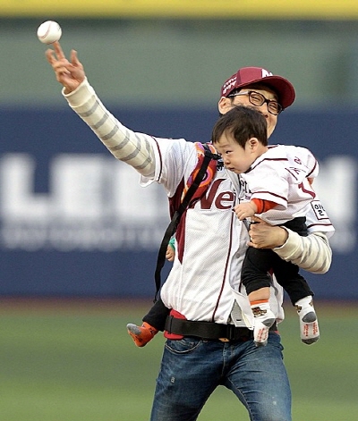 이휘재 쌍둥이 시구, 아들 안고 업고 넥센-두산전서 완벽 시구..."아들 사랑 야구 사랑 짱!"