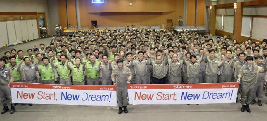 | ▲ 지난달 13일 열린 결의대회에 참가한 STX조선해양 직원들이 기념촬영을 하고 있다./STX조선해양 제공 | ||