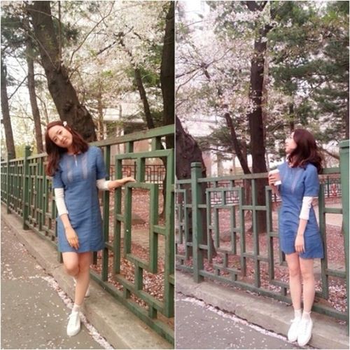 사진 속 김민정은 푸른색 원피스에 하얀 운동화를 깔끔하게 매치해 벚꽃 나무와 한데 어우러진 모습을 선보였다. 김민정의 수수한 차림에도 돋보이는 각선미가 두드러진다.