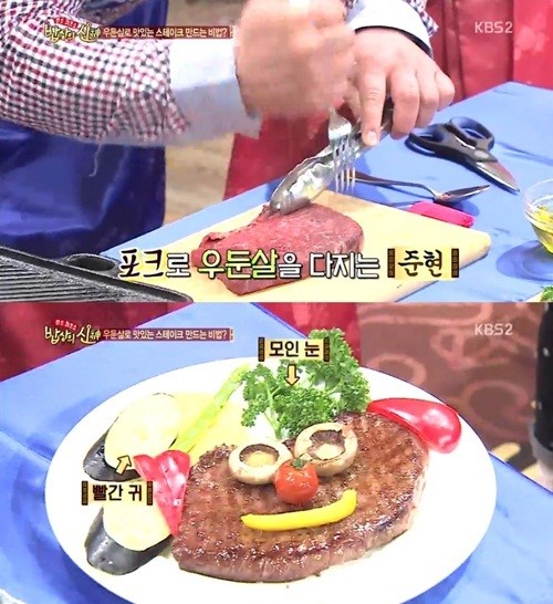 김준현은 먼저 포크로 우둔살의 근육을 끊어주고 올리브유로 고기의 육즙을 살려 냈다. 이후 양송이, 토마토 등으로 구운 고기를 장식해 ‘신동엽스테이크’를 완성했다.