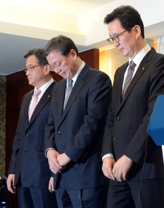 | ▲ 지난 1월 카드3사 대표가 개인정보유출에 대해 사과하고 있다/뉴시스 | ||