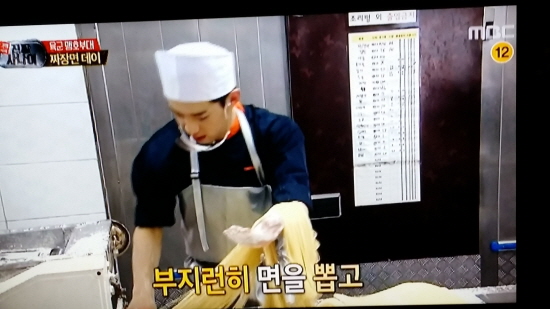 | ▲ 건형과 헨리가 자장면 면발을 뽑고 있다. | ||