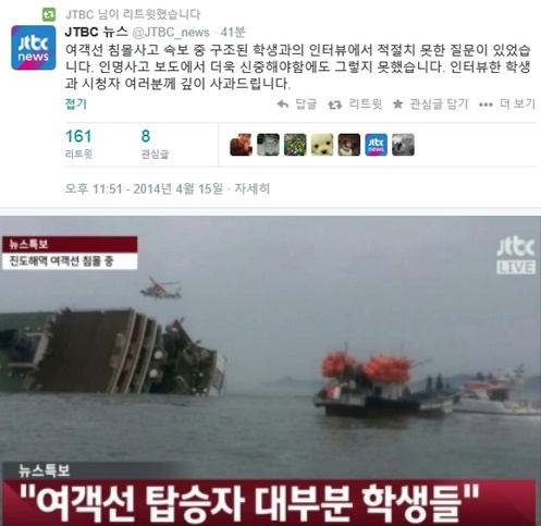 JTBC 측은 이날 공식 트위터를 통해 "JTBC 뉴스는 여객선 침몰사고 속보 중 구조된 학생과의 인터뷰에서 적절치 못한 질문이 있었다"며 "인명사고 보도에서 더욱 신중해야함에도 그렇지 못했다. 인터뷰한 학생과 시청자 여러분께 깊이 사과드린다”라며 공식 사과했다.