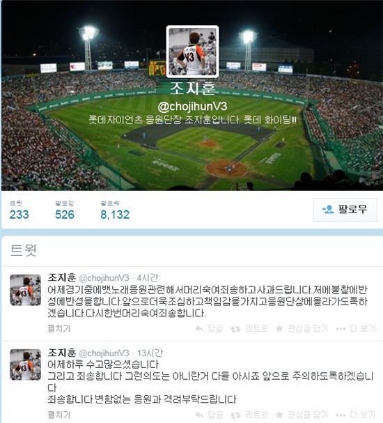 비난이 거세지자 그는 "어제 경기 중에 뱃노래 응원 관련해 머리숙여 죄송하고 사과드립니다. 저의 불찰에 대해 반성을 하고 있습니다. 앞으로 더욱 조심하고 책임감을 가지고 응원단상에 올라가도록 하겠습니다. 다시 한번 머리 숙여 죄송합니다"라며 재차 사과 트윗을 올렸다.