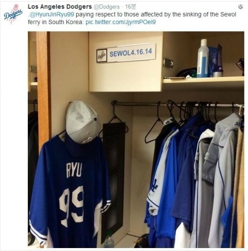 다저스 트위터는 "한국에서 벌어진 세월호 여객선 침몰 사건의 희생자를 추모하며"라고 전했다. 메이저리그는 모자에 사무국이 인정하지 않은 문구 등을 적는 것을 철저히 금하고 있다.