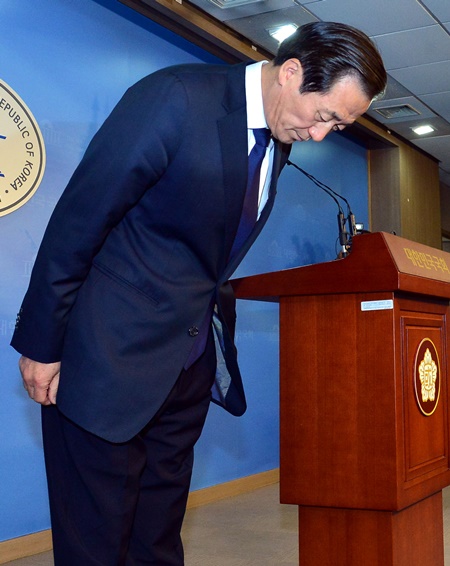 | ▲ 새누리당 서울시장 경선 후보인 정몽준 의원이 21일 오전 서울 여의도 국회 정론관에서 기자회견을 열고 막내 아들의 '진도 세월호 침몰 사건'의 SNS 글과 관련해 대국민 사과를 하고 있다/뉴시스 | ||
