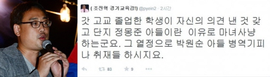 21일 변희재 대표는 자신의 트위터를 통해 “갓 고교 졸업한 학생이 자신의 의견 낸 것 갖고 단지 정몽준 아들이란 이유로 마녀사냥 한다”며 두둔하는 글을 남겼다. 이어 “그 열정으로 박원순 아들 병역기피나 취재들 하라”고 덧붙였다.