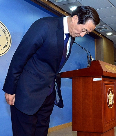 정몽준 의원은 21일 서울 여의도 국회 정론관에서 기자회견을 열고 "침몰 사고 희생자 유가족과 실종자 가족 여러분, 그리고 국민 여러분께 머리 숙여 깊이 사죄드립니다"며 고개를 숙였다.