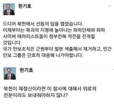 한기호 의원은 또 "드디어 북한에서 선동의 입을 열었습니다. 이제부터는 북괴의 지령에 놀아나는 좌파 단체와 좌파 사이버 테러 리스트들이 정부 전복 작전을 전개할 것"이라고 주장했다.