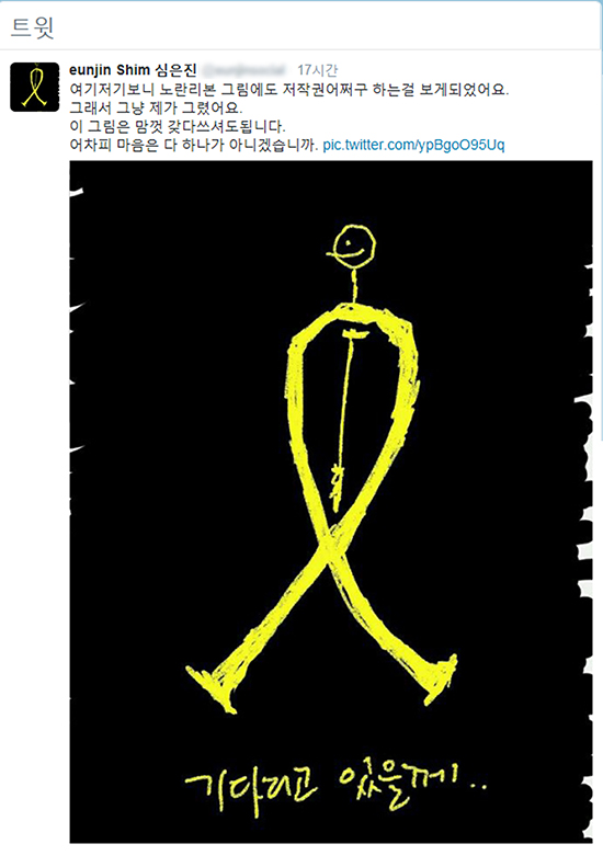 걸그룹 베이비목스 출신 배우 심은진은 22일 자신의 트위터를 통해 "여기저기보니 노란리본 그림에도 저작권 어쩌구 하는걸 보게 됐어요. 그래서 그냥 제가 그렸어요. 이 그림은 맘껏 갖다 쓰셔도 됩니다. 어차피 마음은 다 하나가 아니겠습니까"라는 글과 함께 한 장의 사진을 게재하며 노란리본 캠페인의 동참을 알렸다.