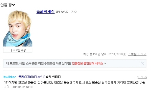 중국 상하이미디어그룹(SMG) 채널 영 TV 의 예능 프로그램 '한위싱동타이'의 MC 이자 가수 인 플레이제이 는 23일 자신의 트위터 를 통해 "RT 작지만 간절한 마음을 담아봅니다. 여러분 동참해주세요. 세월호 탑승한 친구들에게 기적이 일어나길 바랍니다"라며 노란리본 캠페인에 동참했다.
