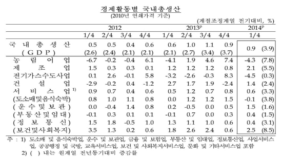 24일 한국은행이 발표한 '2014년 1/4분기 실질 국내총생산(속보)'에 따르면 GDP는 전기대비 0.9% 성장했다. 또 GDP는 전년대비 3.9% 성장했다.