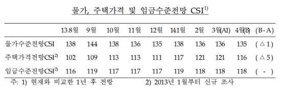 | ▲ 물가, 주택가격 및 임금수준전망 CSI/출처=한국은행 | ||