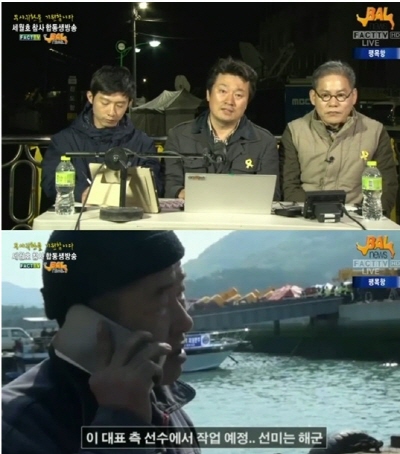 이상호 기자는 25일 밤 11시부터 팽목항 방파제를 배경으로 팩트TV와 함께 합동 생방송을 진행했다.