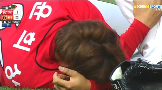 강한 타구에 남성 급소를 맞은 윤희상은 마운드위에서 쓰러져 극심한 고통을 호소했다. 그의 상태를 살피러 나온 트레이너의 발목을 부여잡으며 고통에 몸부림치는 모습이 안타까움을 더했다.