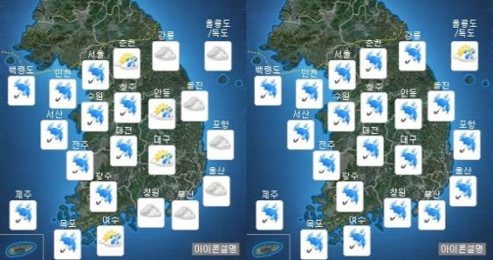 | ▲ 내일(27일) 오전(왼쪽), 오후 기상 예보 /기상청 사진 캡처 | ||