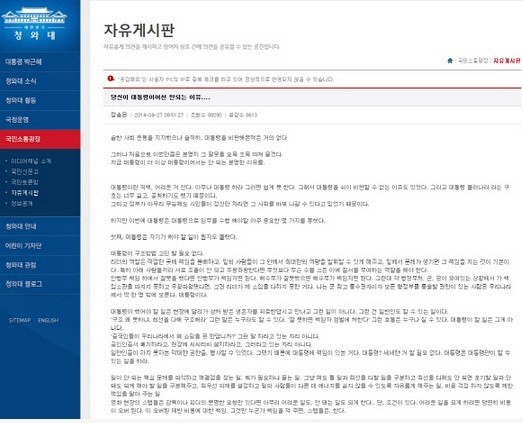 지난 27일 정 모씨는 청와대 홈페이지 자유게시판에 “지금의 대통령은 더 이상 대통령이어서는 안 된다”며 대통령이어선 안 되는 이유 세가지를 게시했다.