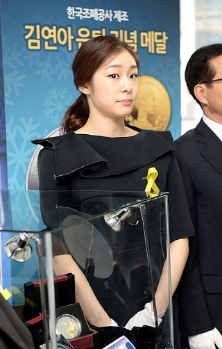 | ▲ 김연아가 28일 열린 은퇴메달 발매식에 검은색 옷차림에 노란리본을 달고 나와 세월호 희생자들을 애도했다./사진=뉴시스 | ||