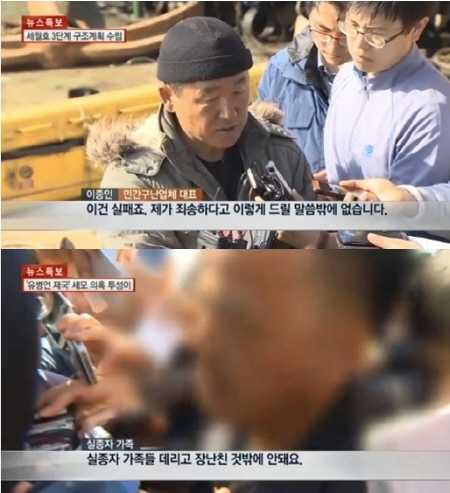 | ▲ 이종인 알파잠수기술공사 대표가 1일 다이빙벨 실패를 선언하고 철수해 유가족들이 "장난친거냐"며 격분했다./사진=뉴스y 방송 캡처 | ||