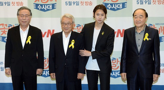 | ▲ 꽃할배수사대 제작발표회(왼쪽부터 배우 변희봉, 이순재, 김희철, 장광)/뉴시스 | ||