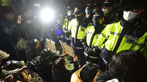 | ▲ 세월호 유가족들이 9일 세월호 희생자와 교통사고 사망자 수를 비교했다고 알려진 김시곤 KBS 보도국장의 사과를 요구하다 무산되자 청와대로 진출, 경찰과 대치하고 있다./사진=뉴시스 | ||