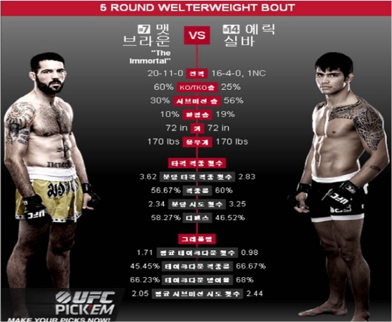 11일(한국시각) 미국 신시내티 US 뱅크 아레나서 열리는 'UFC FIGHT NIGHT 40'에서 브라운과 실바가 맞붙는다. 랭킹은 웰터급 7위의 브라운이 14위의 실바에 앞선다.