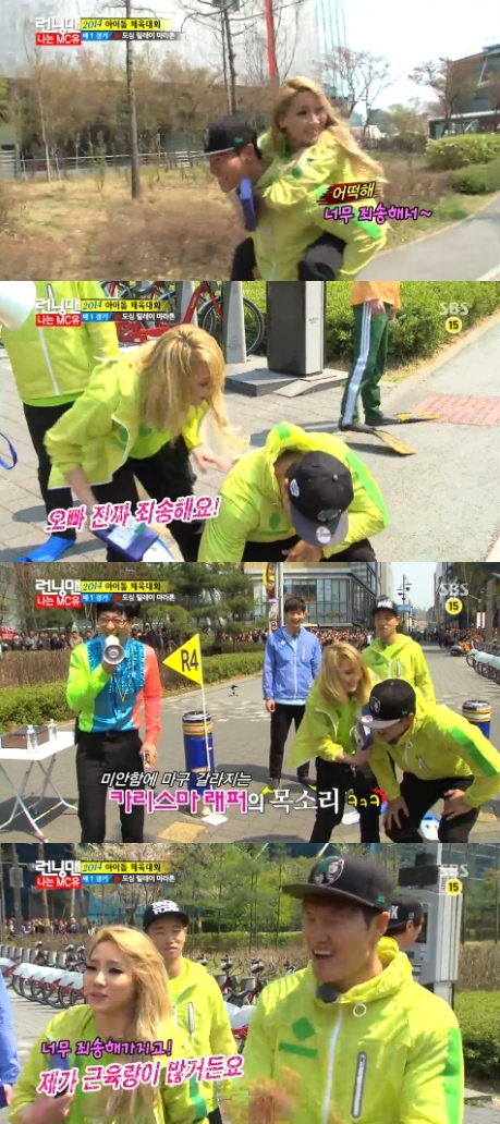 본인을 계속 등에 업은 채 마라톤 경주를 벌인 김종국에게 씨엘은 “너무 죄송하다 어떡하냐”는 말을 되풀이하며 미안한 기색을 보였다.