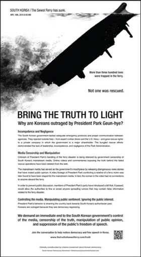 뉴욕타임즈 11일자(현지시각) 19면에는 "진실을 밝혀라(Bring the Truth to Light)"란 제목으로 세월호 참사에 대한 한국정부의 문제점을 비판하는 내용의 광고가 게재됐다.